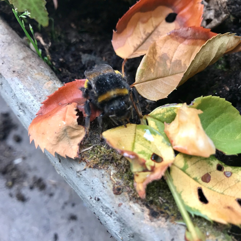 Something caught my eye crawling on my bedroom floor – it was a large fluffy bumble bee!